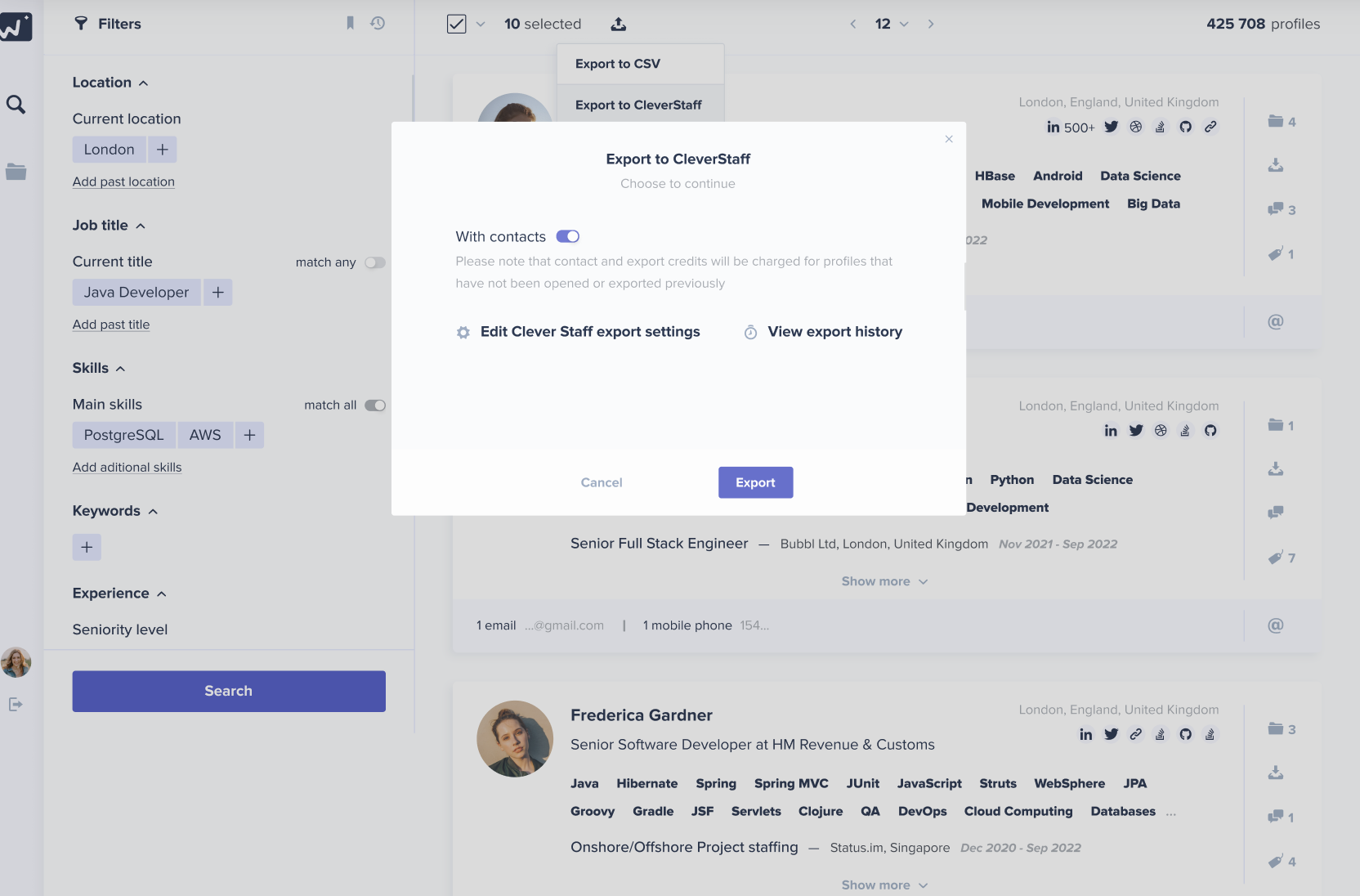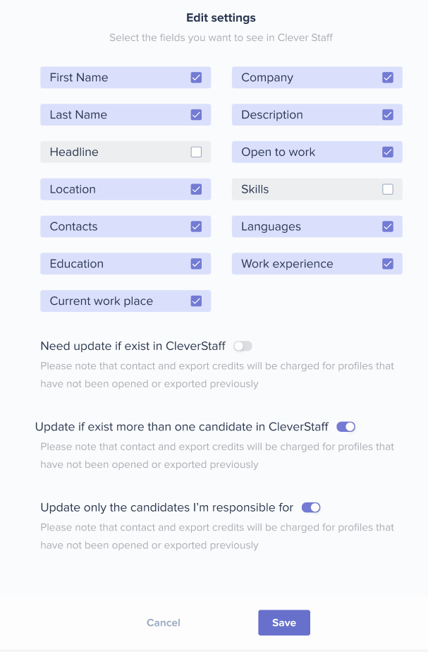 When you click “Export to CleverStaff,” you see an export settings button for CleverStaff and can choose specific details you want to include: First and Last Name, Headline, Location, Contacts, Education, Current Workplace, Company, Description, Open to Work status, Skills, Languages, and Work Experience.